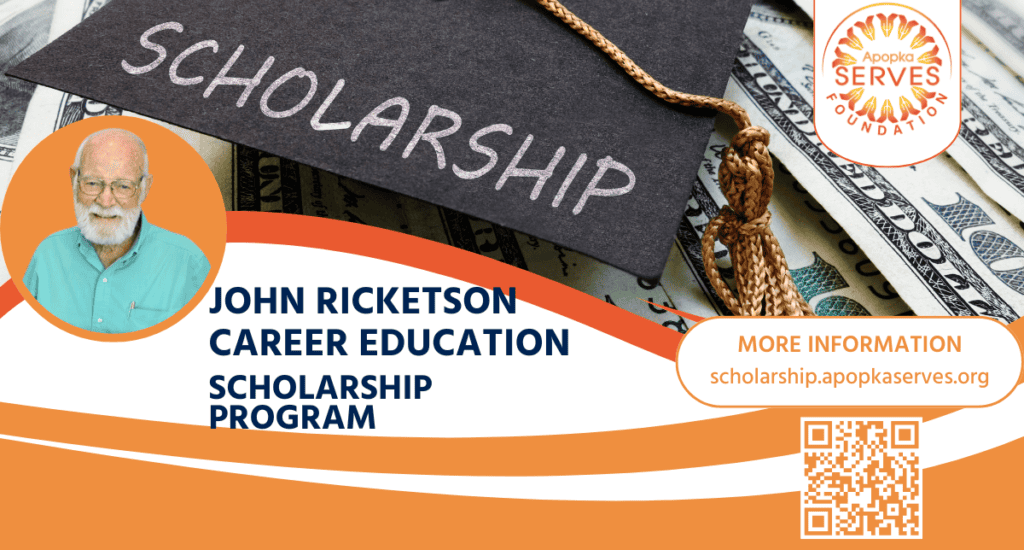 In honor of John Ricketson, a prominent community business leader and publisher for the Apopka Chief and Planter for over 45 years, the Apopka Serves Foundation, a 501(c)(3) non-profit, is proud to introduce the John Ricketson Career Education Scholarship Fund. This scholarship aims to support local students with a focus on budding leaders in business, entrepreneurship, and technical careers.